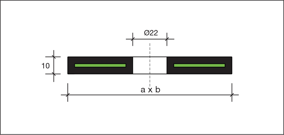 Das Montagelager Typ mo ist ein bewehrtes Elastomerlager (Bewehrung mit 1 Blech 2 mm dick). Es wird zum Ausgleich zwischen z.B. Fertigteilen eingesetzt. Die max. mittlere Pressung beträgt 15 N/mm2. Das Lager ist 10 mm dick und hat eine mittige Bohrung ∅ 22 mm.