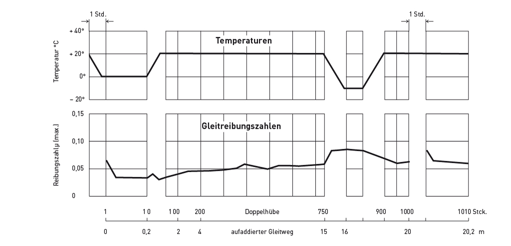 Das Gleitverhalten des Großflächen-Gleitlagers Serie F 5 wurde von der MPA Stuttgart ermittelt. Ein durchschnittliches Ergebnis einer solchen Kontrolle zeigt das nachfolgende Diagramm.