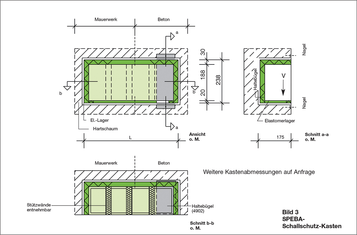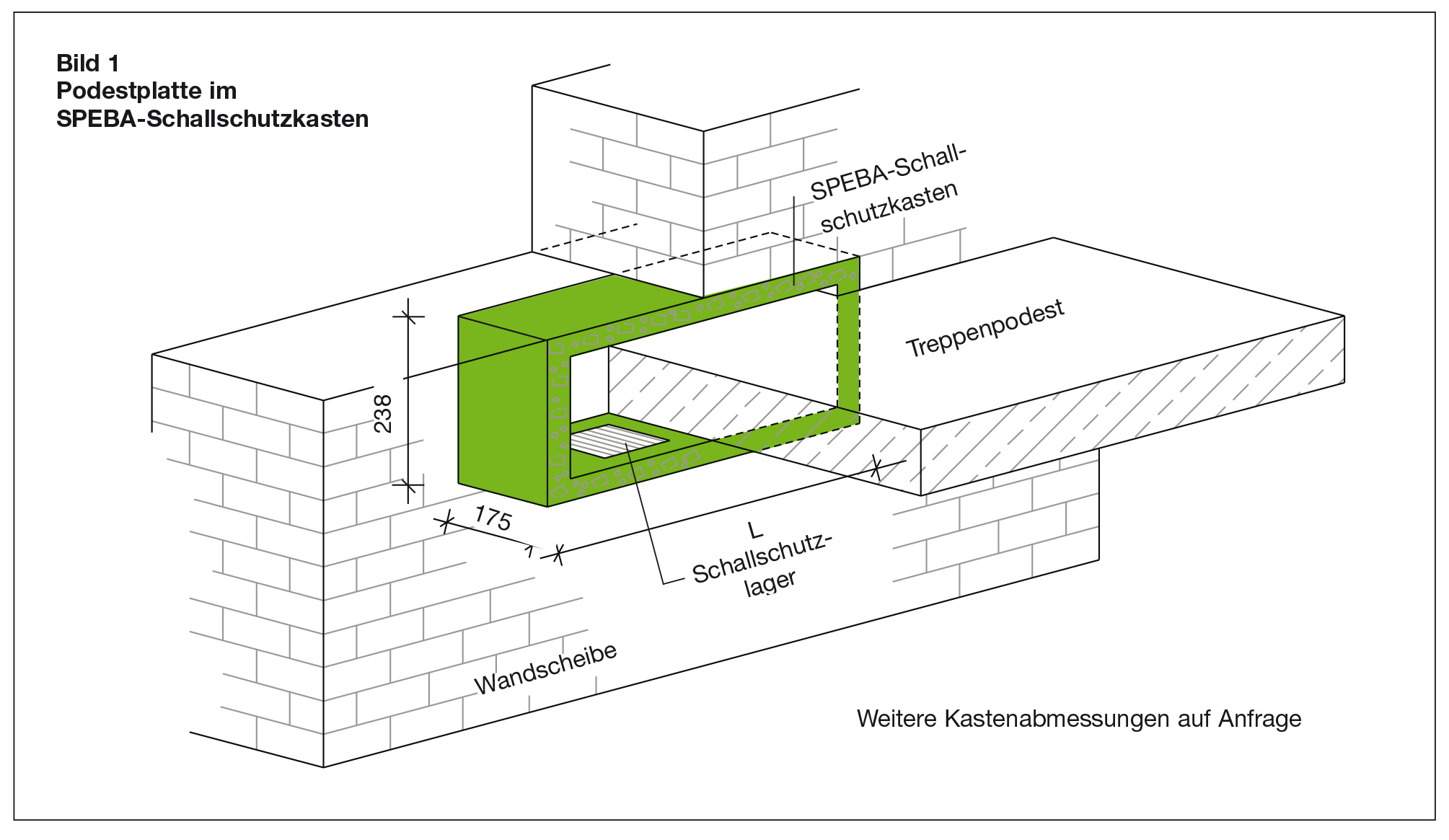 SPEBA® Schallschutz-Kästen übernehmen "punktweise" (statt linienartig) die Auflagerkräfte von z.B. Podestplatten in vorgesehenen Aussparungen. So entfällt die Schwächung der Wand durch die sonst notwendige "Einnutung" der Podestplatte. Gleichzeitig werden Punktlager elastisch ausgebildet, Podestplatte und Wand von einander getrennt und Schwingungs- und Schallschutz (Körperschall) möglich. Die Schallschutzverbesserung beträgt nach Untersuchungen des Fraunhofer-Instituts Prüfbericht Nr. P-BA 228/1995.